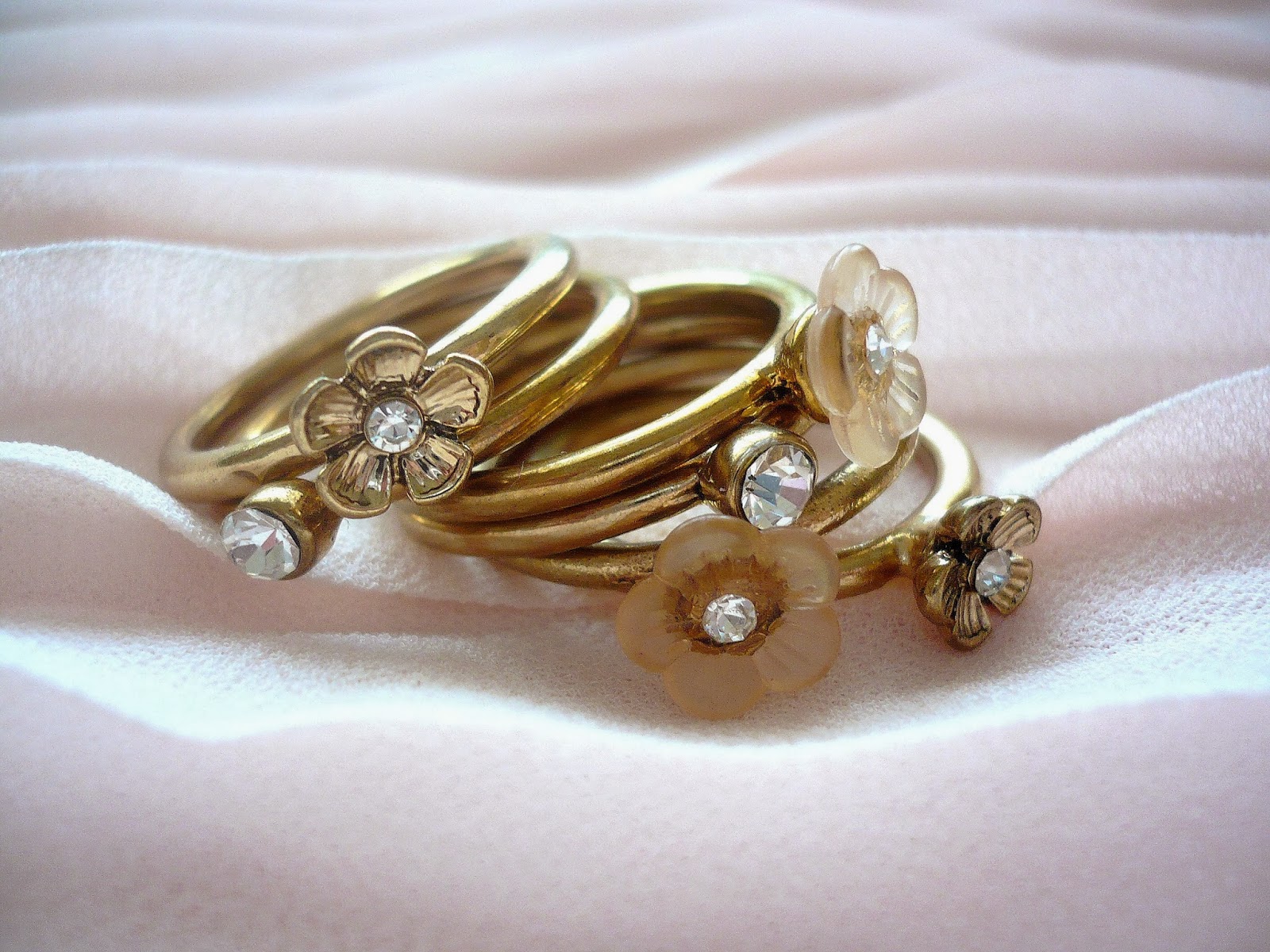 Já to s těma šperkama měla obráceně. Už od školky jsem měla ruce plný barevných prstýnků (asi největší skvost byl žlutej úmělohmotnej dinosaurus s fialovou hřívou) a náramky barevný s velkým srdíčkem uprostřed. Bez toho bych nedošla ani na zastávku. Podotýkám, že mi byly tři roky. A ještě jsem měla stejný řetízek jako náramek. Dneska už skoro nic nenosím, jen jemný řetízek a snubní prstýnek. Ale tyhle prstýnky bych brala hned:-)